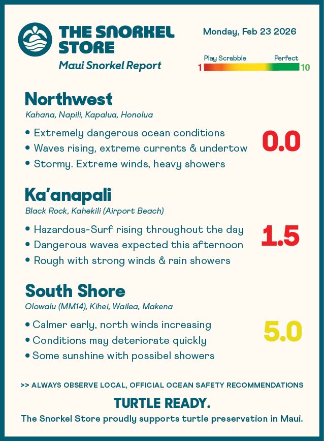 A storm system is moving over Maui today, bringing strong winds, periods of heavy rain, and rapidly rising surf. A High Surf Advisory is in effect for Northwest and Ka’anapali, along with a Flood Watch across the island. While the South Shore is relatively calm early, conditions could deteriorate as winds increase and rain moves in. Conditions can change quickly. The system could pass faster than forecast, but dangerous surf and strong winds are still expected.