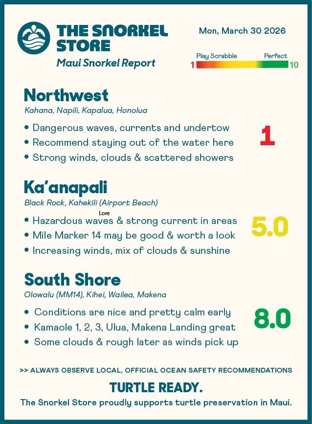 Conditions are looking good this morning with small waves and some nice potential for clear water. The north and south ends of the Kamaole Beaches, the north corner of Ulua, and Makena Landing are great places to check! As winds pick up later, seas will likely become pretty rough. Some cloud cover that may clear before returning.